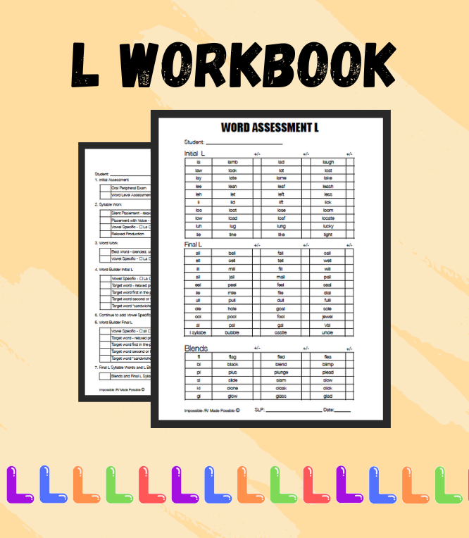 R and L are closely related and often clients who struggle with R will have trouble with L. Building on the principles of R, we developed a set of workbook pages for L. The format is the same and you will be able to leverage everything you know about R with the help of the L Workbook. This is the perfect add-on to give you one more familiar tool in your therapy toolbox.